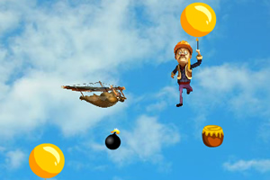 介绍:熊二要学习飞行,飞行中有光头强和炸弹来捣乱哦。吃到金币和蜂蜜会加分哦,碰到光头强和炸弹会减去相应的得分,看谁飞的最好,得分最高。