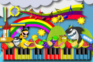 开始游戏前,从中选择一个游戏场景,如不选择,则默认为MUSIC 1;当英文字母经过该区域时,按下相应的按键或者用鼠标在钢琴上按下相应的按键(如果在字母经过其图案中央按下相应按键会加2分,否则加1分);游戏中钢琴按键顺序:从左到右,低音1~7、中音1~7、高音1~7. 低音区音符:1——7 对应键盘按键:Q、W、E、R、T、Y、U 中音区音符:1——7 对应键盘按键:A、S、D、F、G、H、J 高音区音符:1——7 对应键盘按键:Z、X、C、V、B、N、M